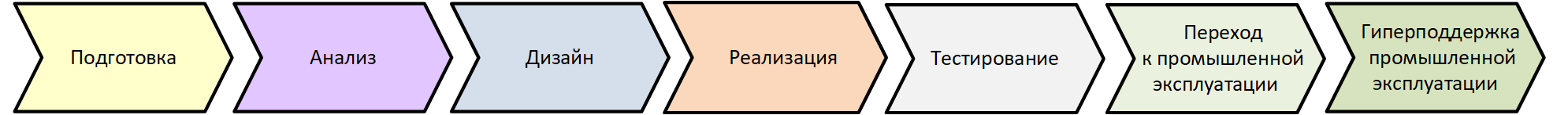 - необходимость применения каскадной, спиралевидной и итерационный моделей определяется на этапе бизнес-кейса в зависимости от характеристик требований, далее подтверждается при тендере и заключении договора на внедрение в рамках предпроектного обследования;
