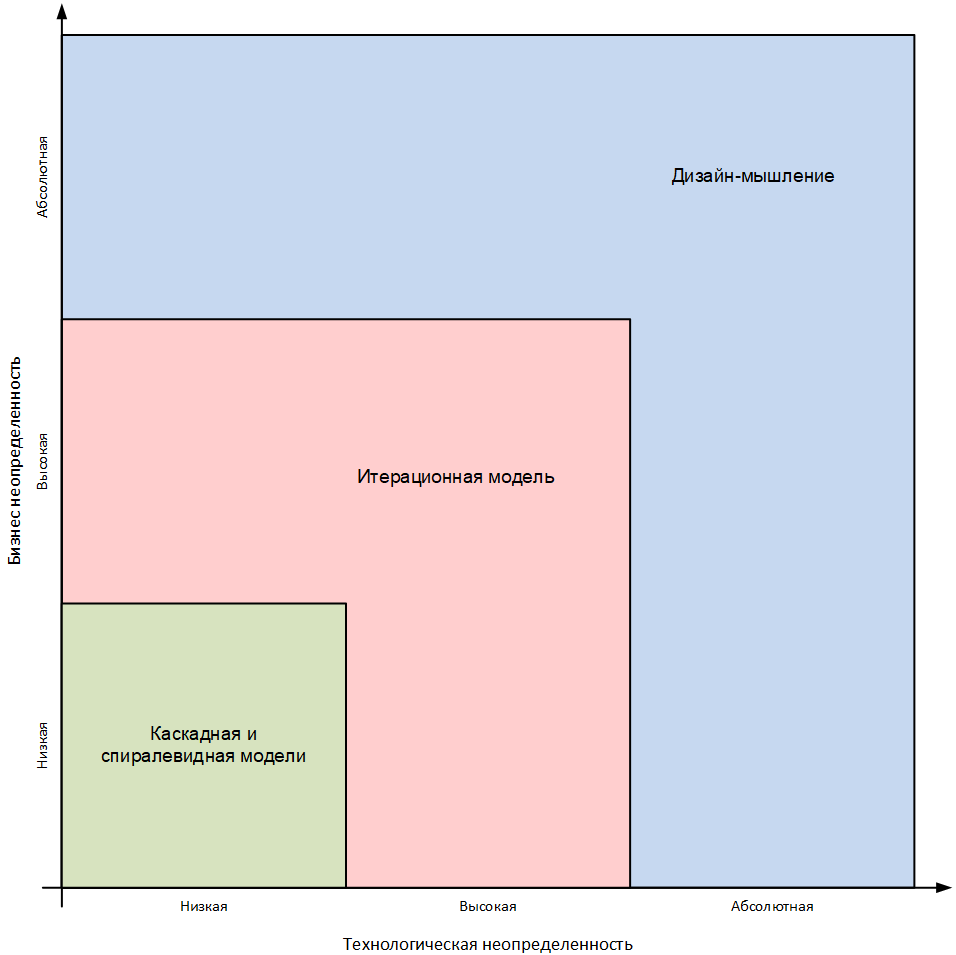 Как видно из рисунка, метод дизайн-мышления смещает границы применения итерационной модели внедрения, занимая область абсолютной неопределенности в бизнес и технологических требованиях.