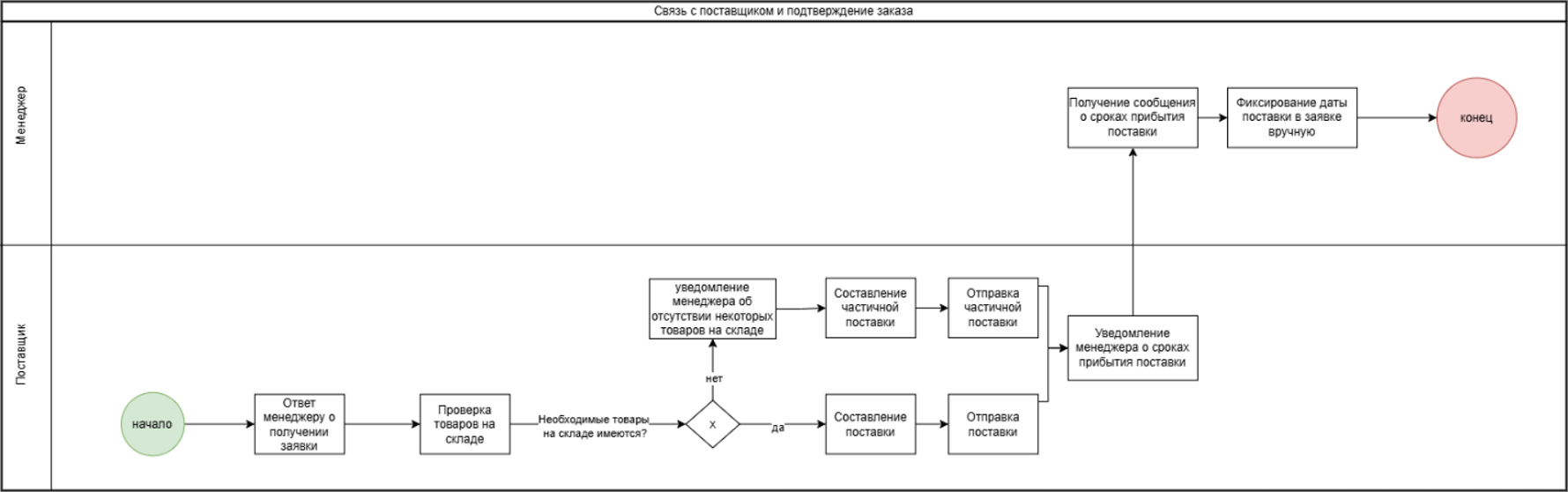 - подпроцесс «Подтверждение заявки поставщиком» характеризует отклик поставщика, проверку остатков на складе и отправку подтверждения. В зависимости от наличия товаров поставщик формирует полную или частичную поставку. Менеджер, в свою очередь, вручную фиксирует дату поставки. Взаимодействие происходит через неструктурированные каналы связи, такие как телефон и электронная почта (рис 5.4);
