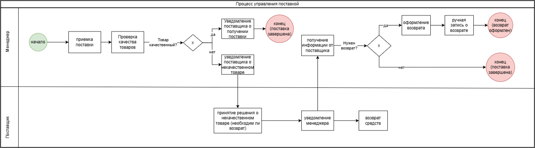 - бизнес-операция «Приёмка товара и возврат» охватывает приемку поставки и возможное оформление возврата. Менеджер вручную проверяет товары на соответствие, при обнаружении отклонений уведомляет поставщика, который может предложить возврат или компенсацию. Возврат осуществляется неформально, не отражается в программной системе и не фигурирует в какой-либо аналитике (рис. 5.5).
