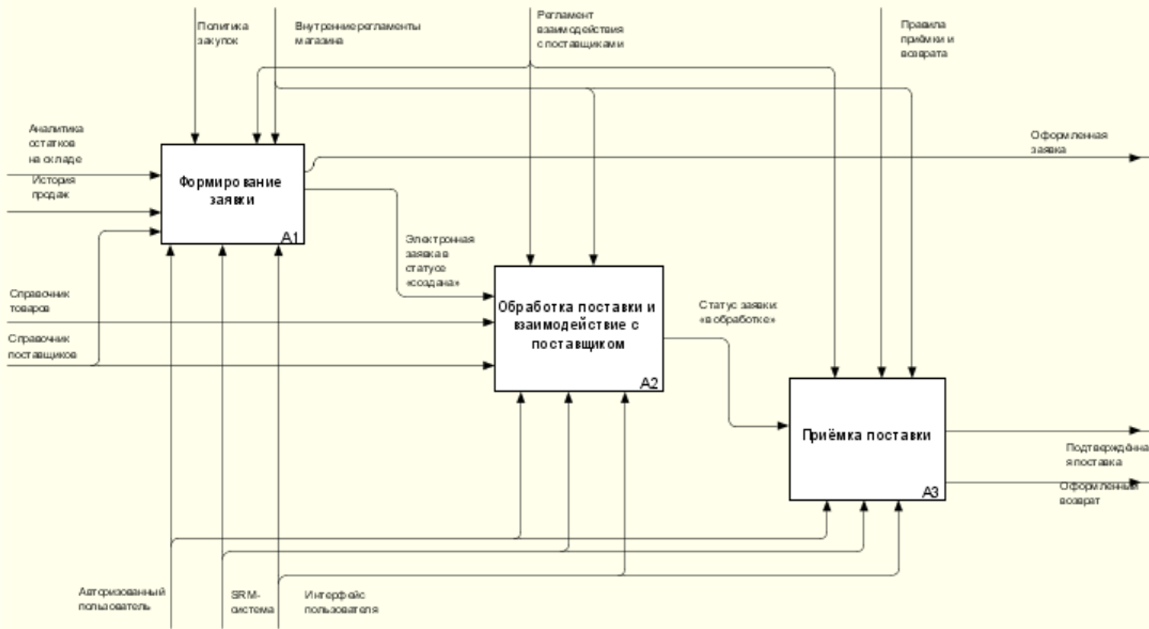 Рис. 5.1. Верхнеуровневое описание ключевого процесса управления поставками в нотации IDEF0 и модели AS-IS