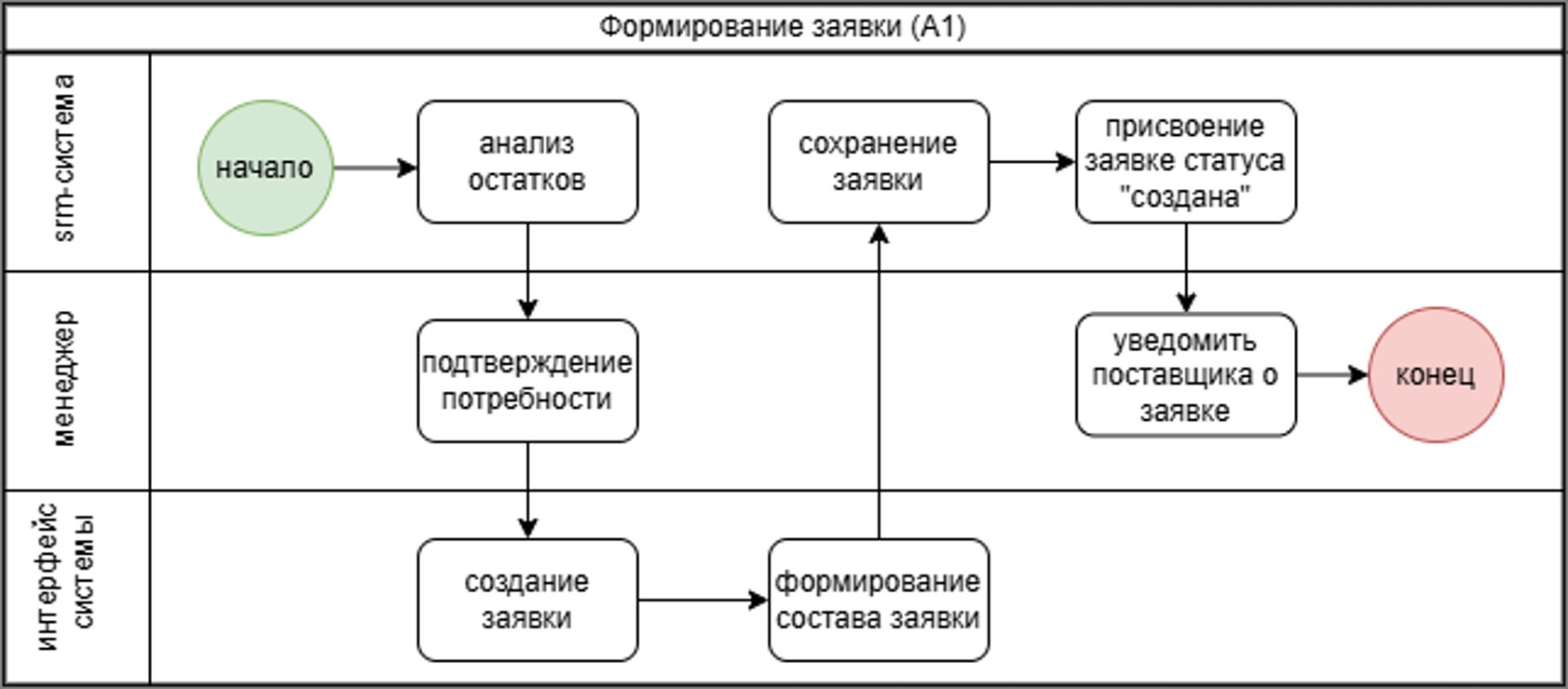 В текущем состоянии процесс создания заявки поставщику носит преимущественно ручной характер. Выявление потребностей осуществляется без использования автоматических инструментов учёта остатков, часто на основе визуальной оценки либо устных запросов от внутренних подразделений. Подбор поставщика ведется, исходя из личного опыта менеджеров и ранее установленных контактов, без сопоставления цен, сроков или условий доставки с аналогами. Документ заявки формируется в произвольной форме в текстовом редакторе или электронной таблице, и передаётся поставщику посредствам электронной почты и телефона. Позже приемка товара сопровождается ручной фиксацией, а возвраты как правило обрабатываются неформально без последующей регистрации.