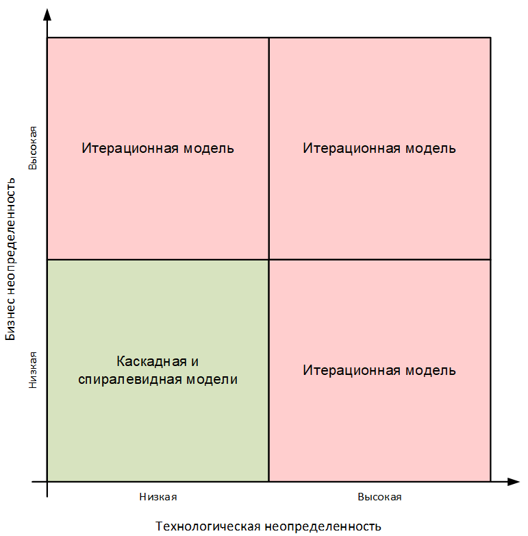 Различный уровень указанных неопределенностей задает содержание матрицы Стейси (рис. 5), предлагающей наиболее подходящую модель внедрения. Так каскадная/спиралевидная модель используется в условиях низких бизнес и технологической неопределенностей, во всех остальных – итерационная [12]. Содержание матрицы подтверждает исходные утверждения: каскадные схемы работают с четко определенными и неизменчивыми требованиями в отличие от итерационных. Конечно, в водопадной модели допускается разумная степень неопределенности, для чего предусмотрен процесс обработки запросов на изменения, однако это больше вынужденная и исключительная мера. Если в ходе проекта возникаем множество подобных запросов на изменение, вероятнее всего, выбрана нерелевантная модель внедрения.