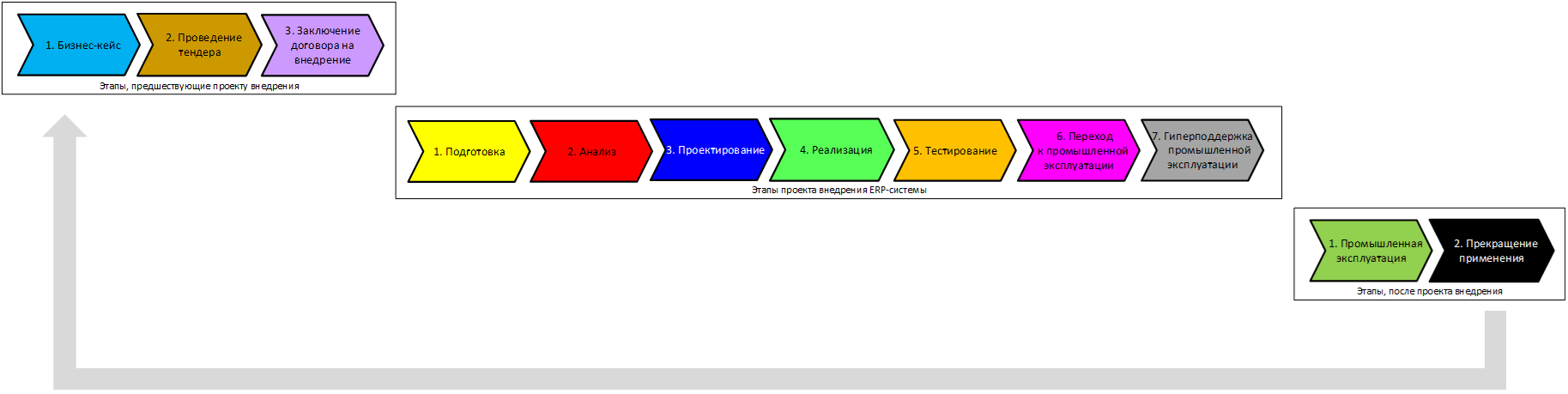 Имплементация программного продукта ведется на основе данных предпроектного обследования. Собранные ранее требования, реестр функциональных разрывов, To-Be архитектура решения, а также план-график внедрения призваны ограничить рамки проекта для доставки его содержания в заявленный срок. Проходя последовательно такие фазы, как: анализ, дизайн, реализация, тестирование, переход, ПО запускается в продуктивный режим эксплуатации (ПЭ) и осуществляется его гиперподдержка. Отключение исторической системы ведется: