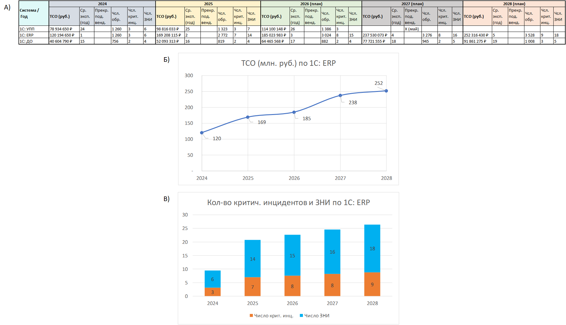 а) общие показатели; б) TCO; в) число критических инцидентов и ЗНИ