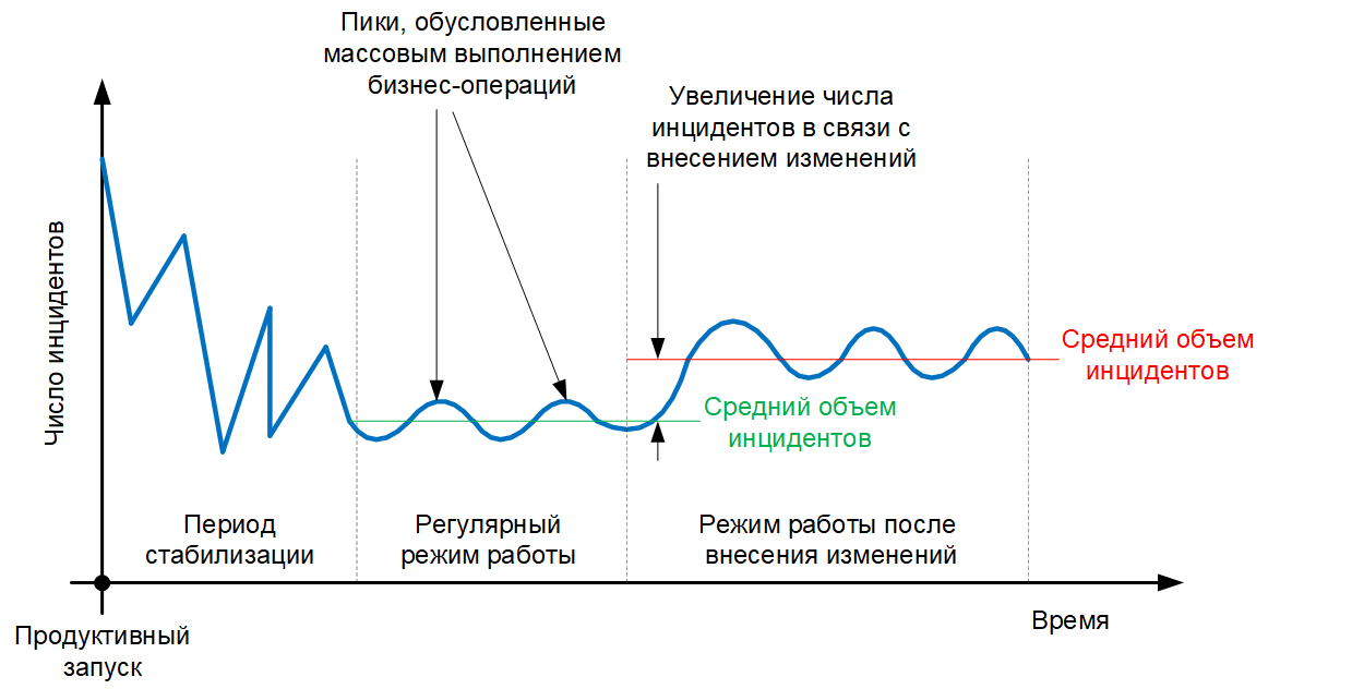 - статистика показывает, что объем инцидентов максимален в интервал от момента продуктивного запуска решения до завершения стабилизации работы системы, то есть первые 1-4 месяца после старта. Далее количество инцидентов становится относительно постоянным с возможными колебаниями при закрытии периода/квартала/года для целей бухгалтерского и управленческого учетов;