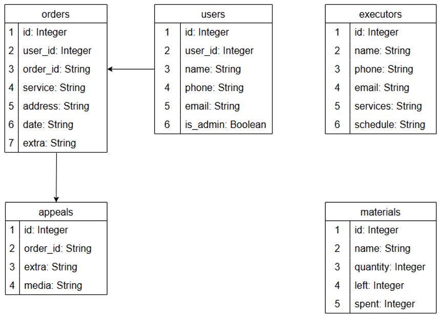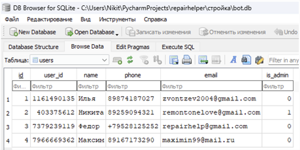 Хранение информации о заказах, клиентах и исполнителях было организовано с помощью SQLite [9] в сочетании с библиотекой SQLAlchemy [10], предоставивших удобное объектно-реляционное отображение данных и надёжное управление ими. Для визуализации и отладки структуры базы данных широко применялся инструмент DB Browser for SQLite [11].