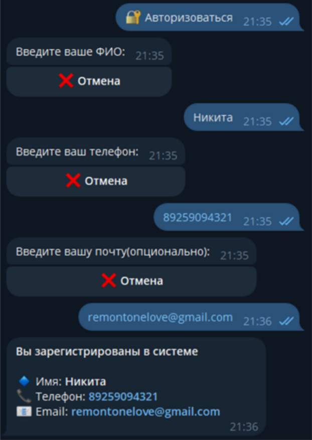 Активно применялся фреймворк Aiogram [8], предоставляющий удобный API для работы с Telegram Bot API и асинхронной обработки сообщений. Это позволило создать интуитивно понятный интерфейс для пользователей, включая меню, кнопки и многоэтапные формы ввода данных.