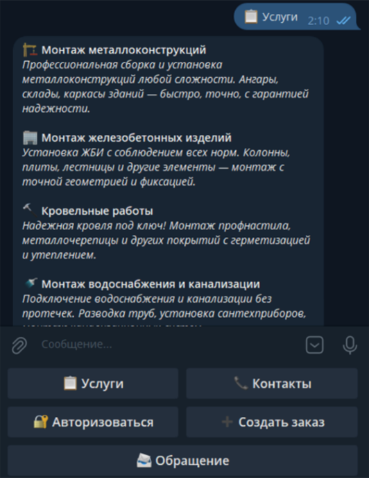 Реализованный программный продукт включает модули управления услугами, клиентами, исполнителями и заказами, что автоматизирует рабочие процессы строительной компании. Разработанный Telegram-бот предоставляет удобный интерфейс для взаимодействия с клиентами, значительно упрощая процесс оформления заказов. В ходе тестирования подтверждена корректность работы всех компонентов приложения, а подробная документация обеспечивает быстрое внедрение и сопровождение.
