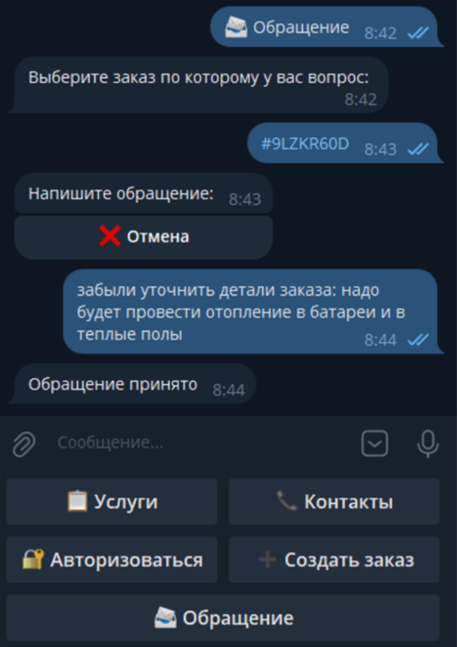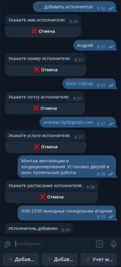 Примеры пользовательских экранов разработанного Telegram-бота даны на рисунках ниже как для клиентской части, так и сотрудников подрядчика (рис. 5.1-5.4 и рис.5.5-5.6).